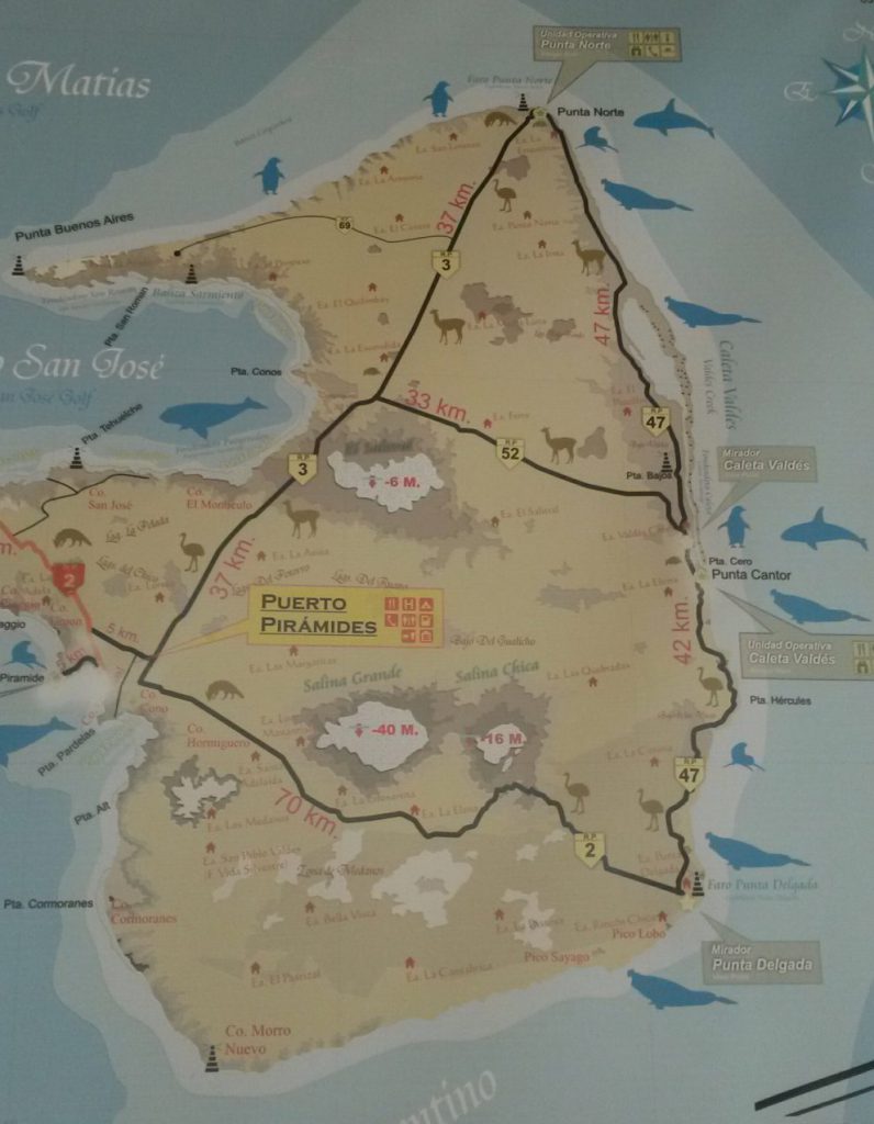 Die Halbinsel kann man mit dem Fahrzeug besichtigen. Es gibt verschiedene Routen die allesammt aus Schotterpisten bestehen. Der Ausgangspunkt ist Puerto Pyramides oder Playa Pardelas. Im Park darf man nicht übernachten. Die offiziellen Strecken ergeben ca. 268 Kilometer. Punta Norte ist bekannt für Orcas. Zwischen Punta Norte und Punta Cantor sieht man Pinguine, Seeelefanten und Seelöwen und viele Vögel. Punta Delgada ist in Privatbesitz und man muss zusätzlich bezahlen, wenn man diesen Abschnitt sehen will. Wieviel genau weiss ich nicht, da wir Punta Delgada nicht angefahren sind. Der Eintritt auf die Halbinsel beträgt 415 Argentinische Pesos pro Person für nicht Argentinier. Einmal bezahlt, darf man so lange auf der Insel bleiben wie man mag. Daher ist es ratsam, sich vorher in Puerto Madryn mit allem Notwendigen auszustatten. Verlässt man den Park und man will später wieder rein, zahlt man den vollen Eintrittspreis nochmals. Auf der Halbinsel selbst, in Puerto Pyramides gibt es kleinere Supermarkte und etliche Restaurants wie auch eine Tankstelle. Das Nötigste fehlt nicht auf der Insel.