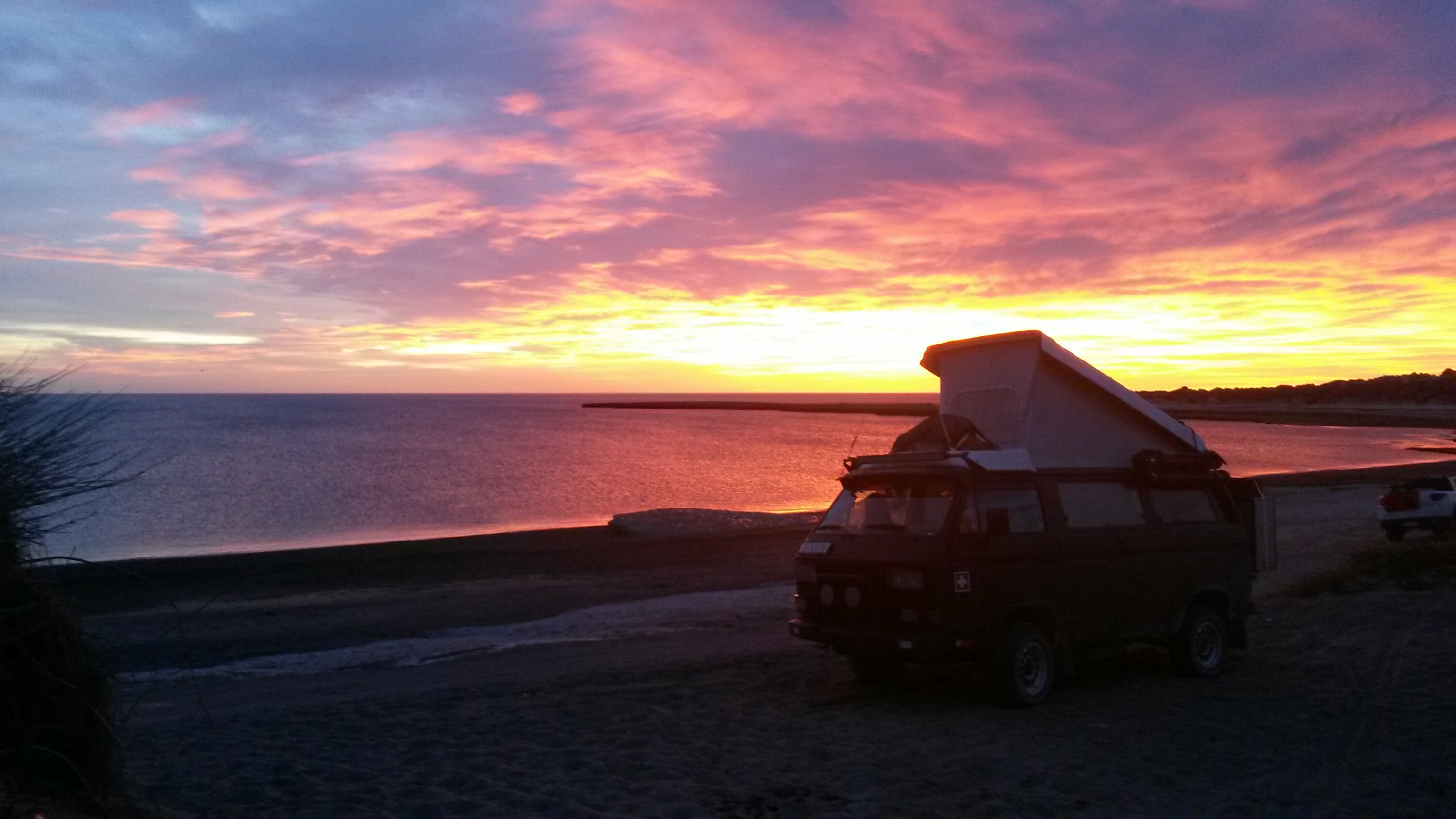 Wir verbringen zwei, drei Tage dort und treffen ganz tolle Menschen. Bei Dirk und Juliana in ihrem Truck, dürfen wir unseren ersten Glühwein 2017 geniessen. Wir unterhalten uns lange mit den beiden und spät kehren wir zu unserem Stitch zurück. Früh am Morgen werden wir von einem Geräusch geweckt, das sich anhört wie wenn ein Dampfkreuzer hornt. Ein tiefes tuuuut… Mister RoadTrip und ich schauen uns verschlafen an. Nochmals ertönt dieses Geräusch. Plötzlich sind wir hellwach, springen auf und stürzen uns in unsere Kleidung. Das sind Wale!