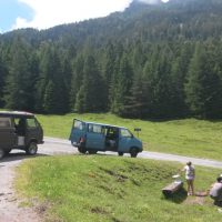 Wir fahren bis nach Tamins, dort gehts über den Kunkelspass, wo wir ein Plätzchen suchen um unsere knurrenden Bäuche ruhig zu stellen. Umgeben von Wald, Wiesen und einer Herde Kühe, bauen wir unsere Grillstelle auf.